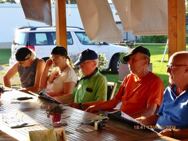 Einige Nichtradler warteten schon auf die Gruppe und schnell wurden die reservierten Plätze eingenommen und die Getränke bei Vanny geordert. Heiß verdient war das kühle Nass und ließ die Strapazen der schweißtreibenden Tour schnell vergessen. Mit leckeren Gerichten wurden dann die Energiespeicher weiter aufgefüllt und bei angeregter Unterhaltung verging schnell die Zeit. Schön war das gesellige Beisammensein, das sich jedoch zu fortgeschrittener Stunde wegen den zahlreich anrückenden Schnaken jäh auflöste.