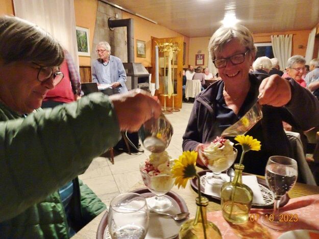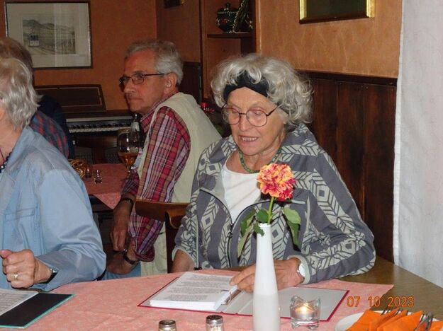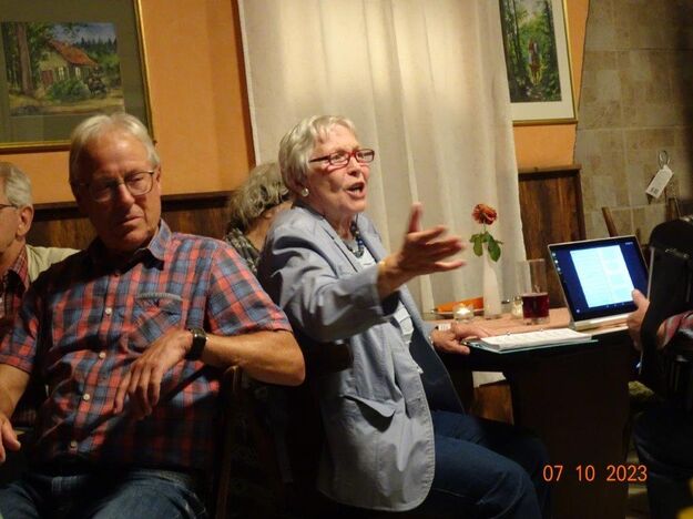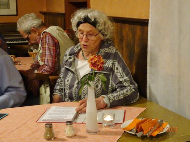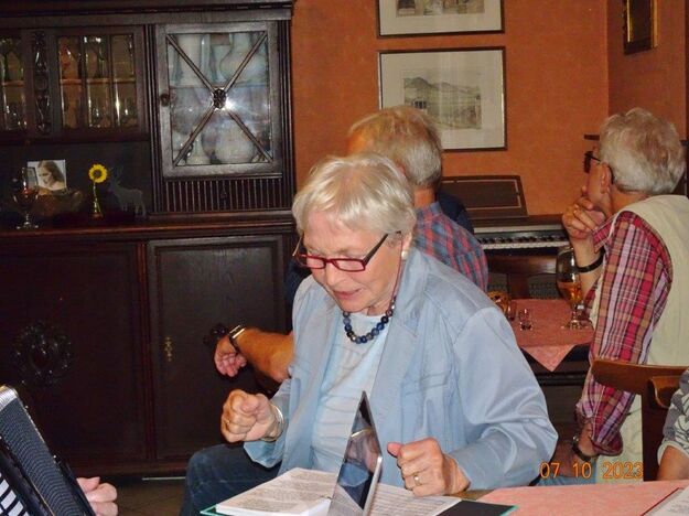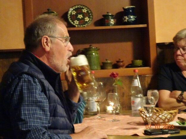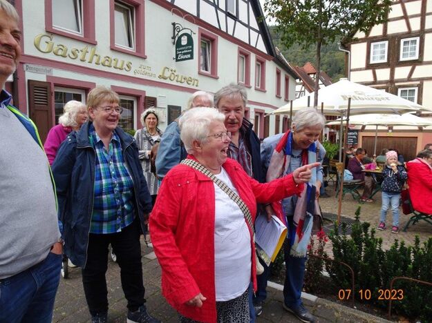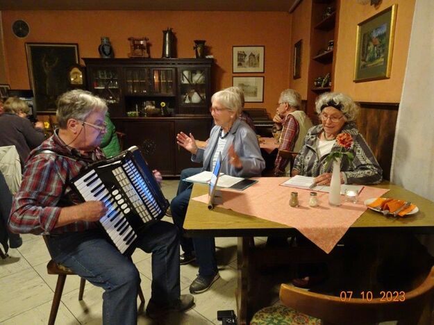 Nun ging´s weiter zu unserem Abschlussziel, dem Edenkobener Tal. Unser Busfahrer musste auf dieser Fahrt Millimeterarbeit leisten – bravo. Die Landschaft ist ein herrliches Wandergebiet, aber uns blieb nur ein schöner Spaziergang zum Hilschweiher und unserem eigentlichen Ziel, der Siegfriedschmiede. Einige, die nicht so gut zu Fuß waren, fuhren mit dem Bus zum Gasthaus, wo schon die Tische für uns eingedeckt waren. Wir nahmen Platz und so konnte die freundliche Bedienung die Getränke- und Essens-Wünsche aufnehmen und wir wurden alle zügig und bestens versorgt. Wie man hörte, hat es rundum geschmeckt, ein Danke an das Siegfriedschmiede-Team. Unser Commander zeigte sich noch von der musikalischen Seite und spielte mit dem Akkordeon stimmige Lieder. Gesanglich von Heidi und Irmgard begleitet wurde geschunkelt und mitgesungen und so langsam ging ein wunderschöner Tag zu Ende. Das „Ausflugs-Schiff“ ist wieder gut in Li-Ho. gelandet, dank unserem exzellenten Bus-Kapitän Yilmaz, dafür ein herzliches Dankeschön. Aber ein ganz großer Dank geht an unseren Commander Klaus, der eine tolle Route mit grandiosen Zielen ausgesucht und sich auch mit Petrus wohlwollend abgesprochen hatte. Unterstützt von seinen Astronessen Heidi und Doris, Jola und Brigitte und auch von unserem Vorstand Klaus Reinhardt, war das für alle Teilnehmenden ein absolut gelungener Tag!