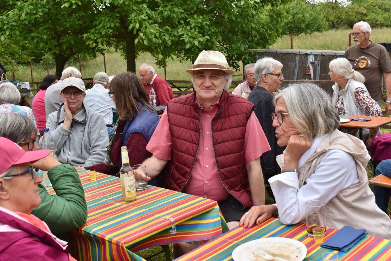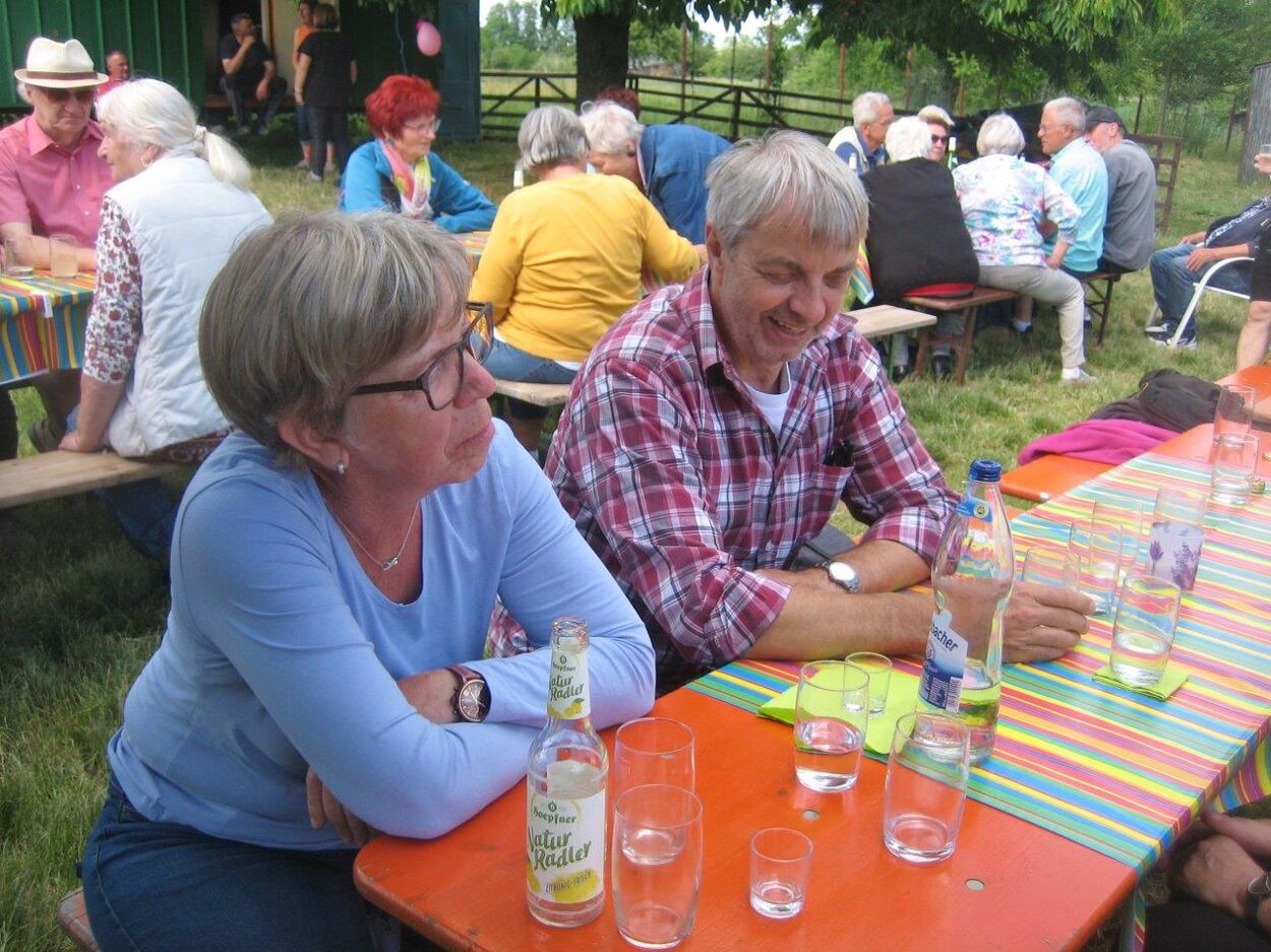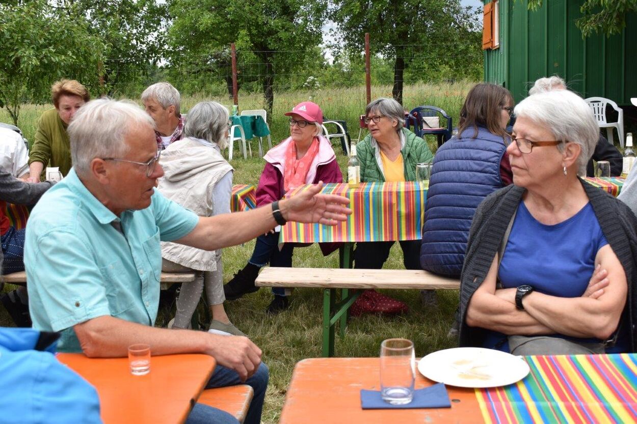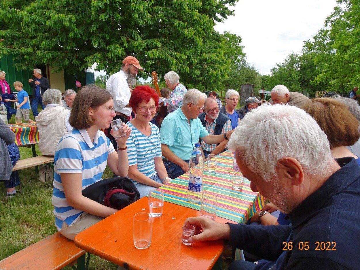 Klaus Eichsteller war mit seinem Akkordeon unermüdlich im Einsatz und Reinhilde Fürniß hatte ihre Gitarre und einige Lieder dabei, so konnten wir Manfred noch nachträglich zum 80. Geburtstag ein gebührendes Ständchen darbringen. Es ließ sich trefflich im Grünen sitzen und ab und an meldeten sich die Schafe mit Geblök, schließlich saßen wir ja auch auf deren Koppel. Auch ein herrlicher Tag geht einmal zu Ende und mit vereinten Kräften wurde zusammen geräumt – herzlichen Dank an alle Beteiligten und vor allem an unsere Gastgeber.