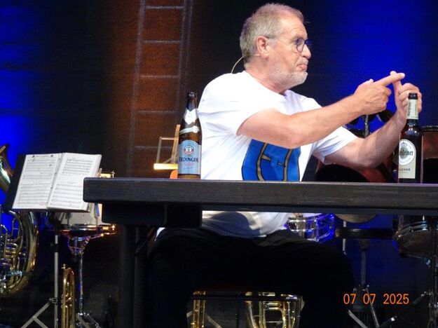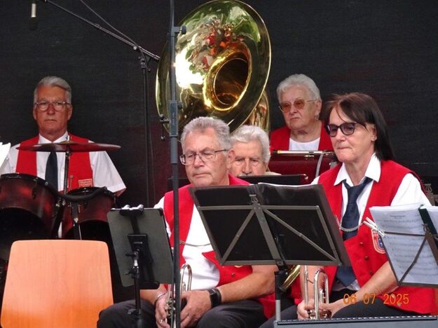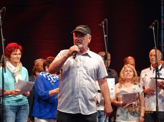 Zum Abschluss des Bunten Abends übernahm dann wieder Uwe Dürr den Dirigentenstab beim Musikzug, denn das obligatorische Badnerlied durfte nicht fehlen. Dazu wurde BGM Michael Möslang auf die Bühne gerufen, er wiederum rief nach Alt-Bürgermeister Waldemar Schütz, der mit ihm die Hymne anstimmte. Die Festgäste hatten sich alle zum mitsingen erhoben und so fand unser schöner Bunter Abend sein Ende. Ein Danke an unseren Vorstand Klaus und ein großer Dank an unsere Gemeinde, dass wir Teil des Programms sein durften und an alle, die dieses Fest mit gestemmt haben. Inzwischen hatte es kräftig abgekühlt und die Gäste verließen den Platz und gingen haam, oder hoom? Auf jeden Fall ins Warme.