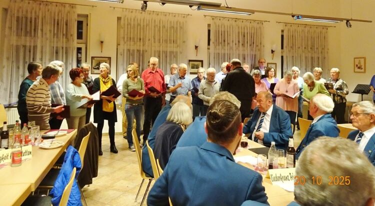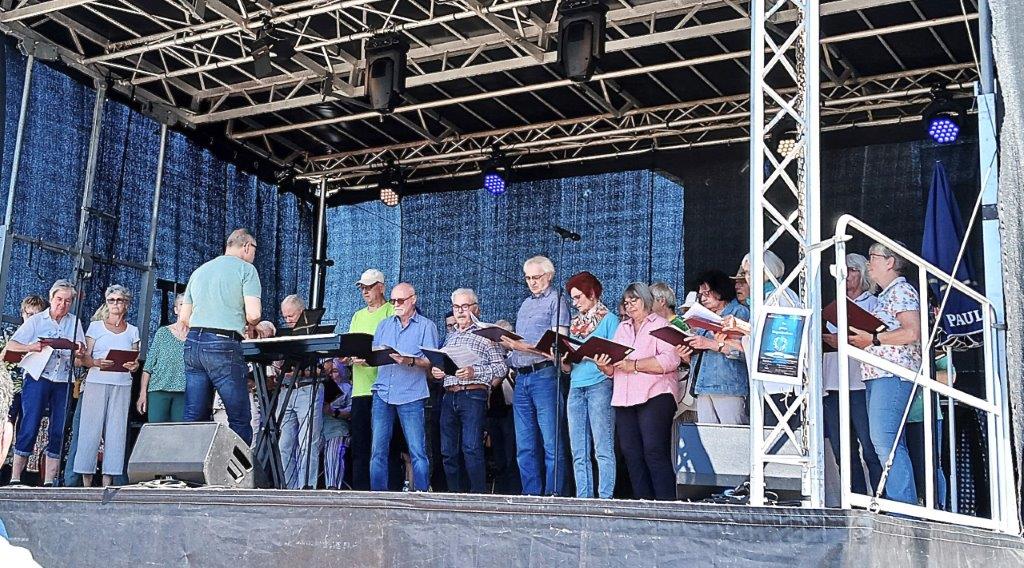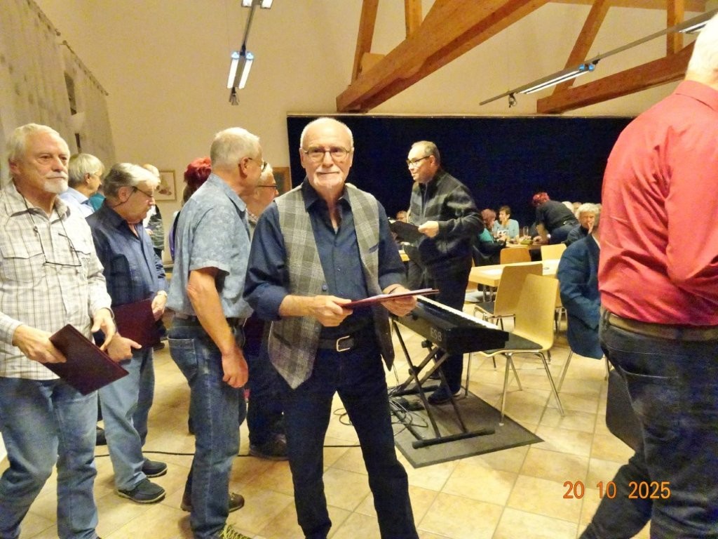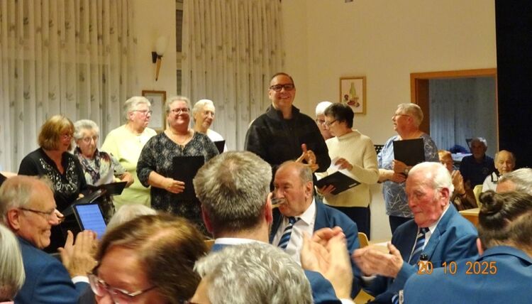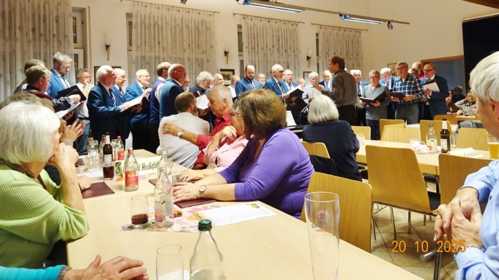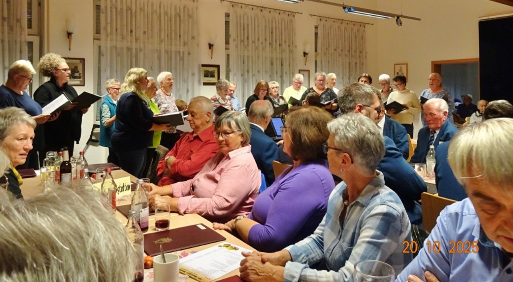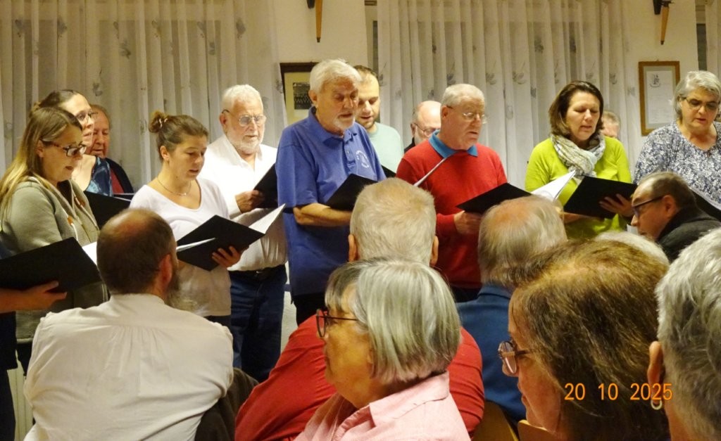 Am Montags 20.10. waren wir bei der Weinkerwe in Spöck im Einsatz. Im gut besetzten Vereinsheim der Eintracht Spöck begrüßte der 1. Vorsitzende Wolfgang Lautenschläger alle Anwesenden und sagte die Chöre, die auftraten, an. Unter der Leitung der drei Chorleiter Jutta Braun-Wingert, Joachim Langnickel und Aldo Martinez traten 7 Chöre auf, die unterschiedliche Chormusik darboten, von traditionellen Liedern, Evergreens und modernen Songs war alles vertreten. Dem Publikum gefiel´s, auch unsere 3 Lieder: „Ein Lied kann eine Brücke sein“, „Spiel mir eine alte Melodie“ und „Why we sing“ kamen gut an. Besonders letzteres, wobei unsere Sängerin Kristin und Ehrenvorstand Harald mit ihren Solostimmen brillierten! Natürlich waren wir auch wieder mit Speis und Trank in Spöck bestens versorgt, bevor wir uns später auf den Heimweg machten.