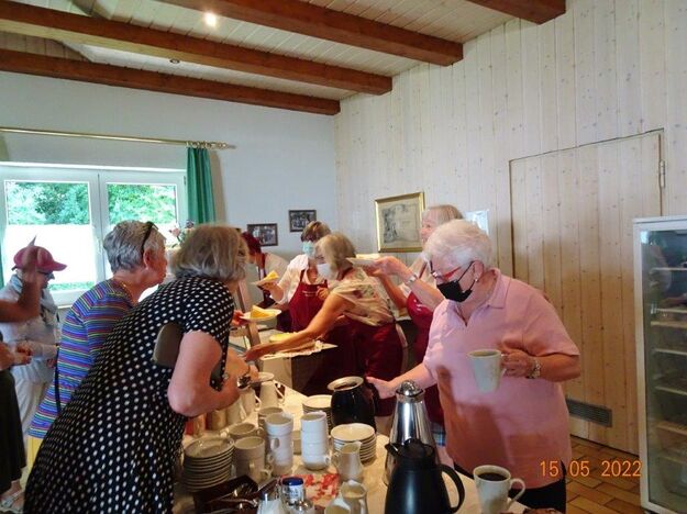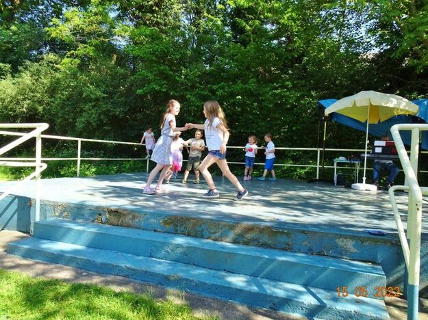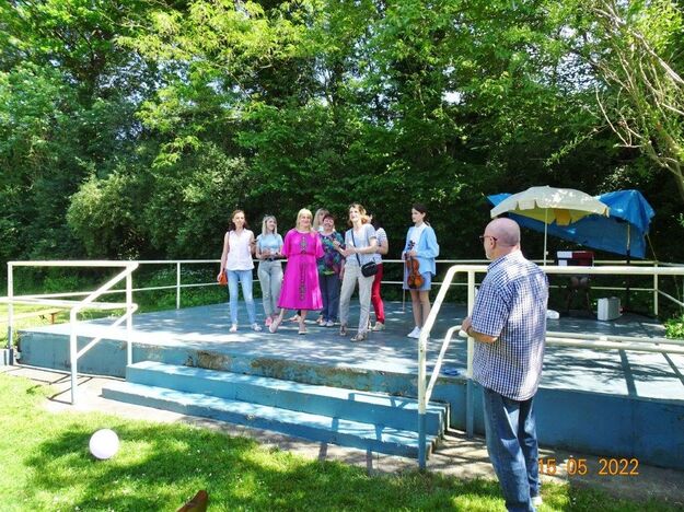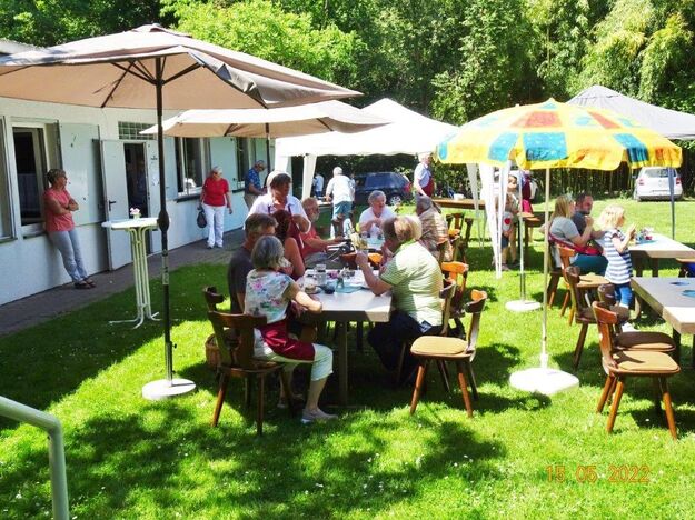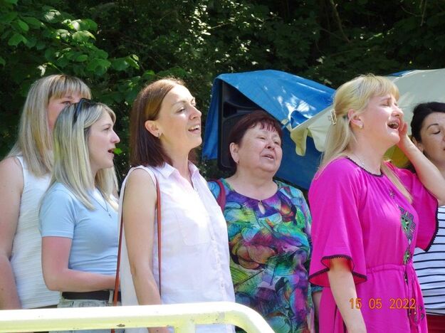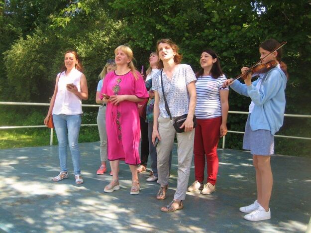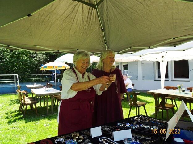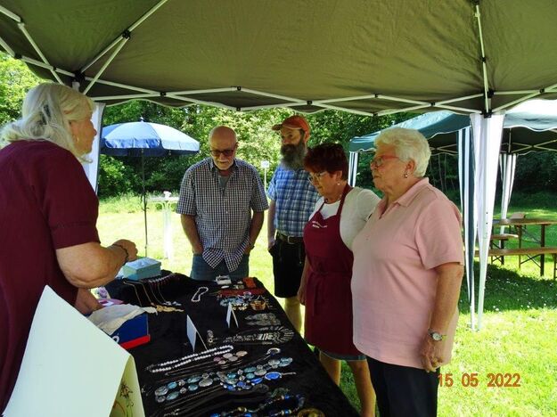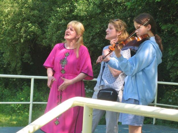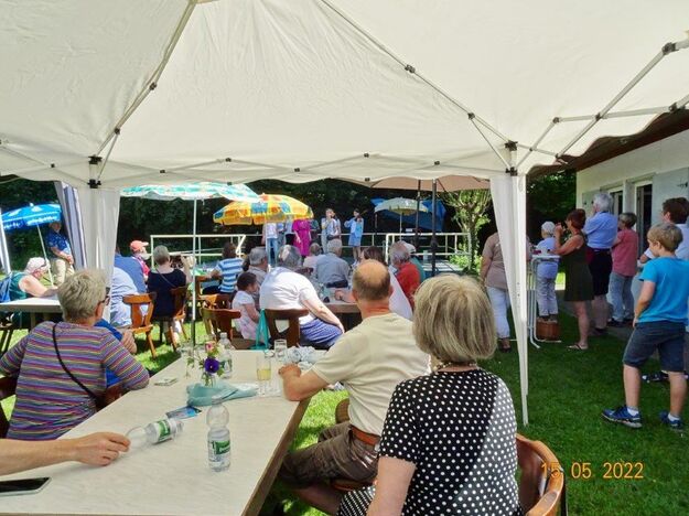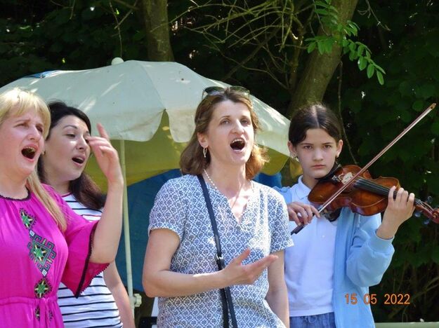 Auch sonntags herrschte schon früh rege Geschäftigkeit, Pavillons, Sonnenschirme, Tische und Bänke wurden aufgestellt und zahlreiche Kuchenspenden gingen ein – vielen Dank an die fleißigen Bäckerinnen und Sponsoren. Im Innenraum wurde auch alles schön dekoriert und die Kuchentheke vorbereitet und bestückt. Wir waren schon etwas aufgeregt, wie wird das Fest angenommen und wie klappt die Verständigung mit den eingeladenen Ukrainern. Christa Jung-Wittiger hatte ein Treffen mit Ukrainerinnen und ihren Kindern organisiert, um ihnen einen schönen Nachmittag zu bieten. Neuland für uns, aber es war ein absolut positives Erlebnis und die ukrainischen Frauen bedankten sich bei uns auf der Bühne und sangen einige Lieder für uns. Viel Seele war da zu hören und zu spüren und auch ergreifend das großartige Geigenspiel der jungen Marie. Ein Talent, das unbedingt gefördert werden muss! Hatte sie just an diesem Tag Geburtstag und bekam von unserer Jola ein Geburtstagspräsent überreicht, danke, Jola und danke Christa für das Sponsoring für die Kinder. Den Ukrainerinnen ganz herzlichen Dank unsererseits für diese wunderbare Einlage, wir würden uns über weitere Begegnungen freuen.