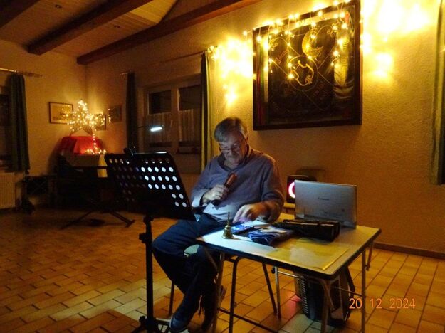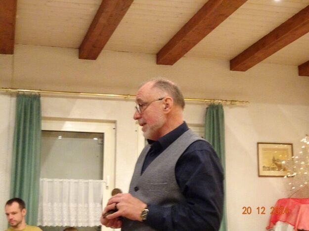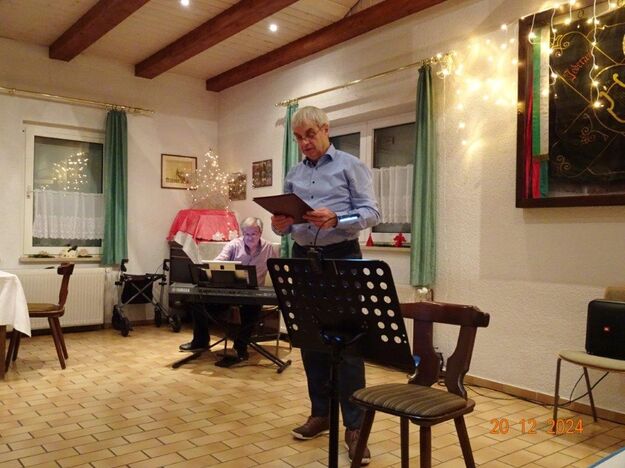 Hartmut führte uns nun wieder souverän durch den 2. Teil unserer Feier, bei dem uns Commander Klaus Eichsteller, bzw. Mc. Beth in seinem Raumschiff Entenfang durch die Galaxien führte und letztendlich mit Leonard Cohens Hallelujah in den Stall des Jesuskindes und dem Sinn der Weihnacht entführte. Brigitte Lang wusste uns eine lustige Geschichte vom doppelten Santa Claus zu erzählen und Klaus Reinhardt hatte eine Geschichte über „Selbstverständlichkeiten“ mitgebracht, wie wahr, dass doch vieles als selbstverständlich betrachtet wird und einem dies erst bewusst wird, wenn man es verloren hat, oder es mit den Augen eines Kindes betrachten kann. Zum Schluss des Programms spielte Klaus Eichsteller das schöne irische Weihnachtslied Fairytale of New York und gemeinsam sangen wir noch einige Weihnachtslieder, bevor dieser schöne Abend langsam zu Ende ging. Ein großes Danke hier wieder an Klaus Eichsteller, der mit seinen musikalischen und anderen Beiträgen einen Großteil des Programms gestaltete und natürlich an Hartmut, der einen guten Conferencier abgab, ebenso allen anderen, die sich am Programm beteiligten. Zudem an alle, die den Erlich so toll gerichtet, dekoriert und hinterher wieder aufgeräumt haben, Ute für die Blumendeko und allen, die für unser leibliches Wohl Leckeres zubereitet hatten. Ihr habt uns allen ein schönes Fest beschert – herzlichen Dank.