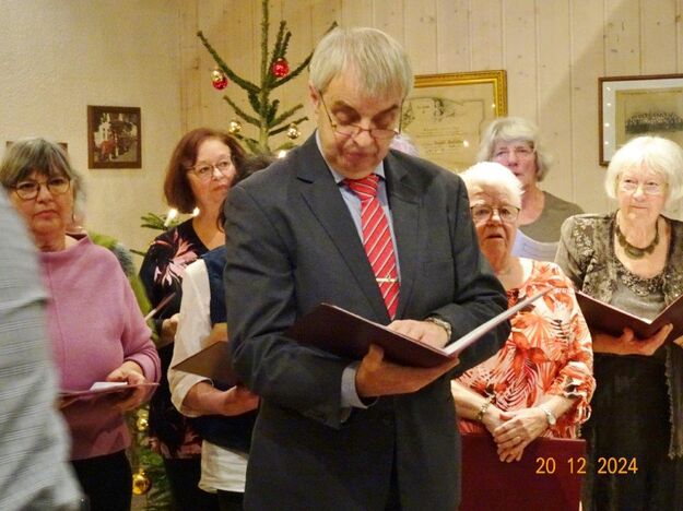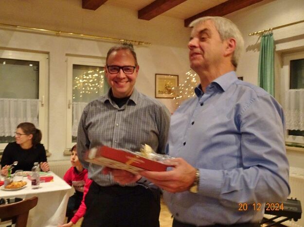 Unsere Weihnachtsfeier fand am 20. Dezember im richtig schön geschmückten Vereinsheim statt und war sehr gut besucht. Aldo Martinez traf mit Frau und Sohn pünktlich im Erlich ein und wir begannen den festlichen Abend mit vier Weihnachtsliedern, die wir gekonnt absolvierten. Der 1. Vorsitzende Klaus Reinhardt begrüßte freudig alle Anwesenden und eröffnete danach das Buffet. Ein Partyservice hatte uns die warmen Speisen geliefert und von den Sängerinnen wurden wieder tolle Salate und Desserts beigesteuert. Nach dem Essen eröffnete Klaus Eichsteller mit einem Hirtenlied und einer Wintermärchen-Liebesballade auf seinem Keyboard das Unterhaltungsprogramm, durch das uns unser Sänger Hartmut auf lockere Art führte. Reinhilde Fürniß trug zuerst ein Gedicht vor, bevor sie uns dann mit ihrer Gitarre ein Lied über die weiße Weihnacht spielte und sang – gut gemacht Reinhilde. Christa Jung-Wittiger las ein Gedicht über eine freche Weihnachtsmaus vor, die wohl über Tage für den Schwund der Weihnachtsbrödlen verantwortlich war. Das gefiel besonders den anwesenden Kindern, die dabei sein und mit uns feiern durften. Hannelore Dürr´s Engelsgedicht zeigte einige Erkenntnisse auf, die uns zwar bewusst, aber leider doch oft nicht umgesetzt werden. Das regte zum Nachdenken an, bevor wir uns dem reich bestückten Dessertbuffet widmen durften, mmhm, lecker!! Es ging uns gut an diesem Abend, auch dank unserer Küchenfeen Alexandra und Heidi, sowie Marion, die uns mit Getränken versorgte, so ließ es sich bestens aushalten. Nach diesen Schlemmereien war es an der Zeit, unserem Dirigenten ein Präsent zu überreichen. Klaus Reinhardt tat dies mit einigen Dankesworten an Aldo Martinez, mit dem das Üben in der Chorprobe Woche für Woche riesigen Spaß macht. Wer dies auch mal testen möchte, kann gerne freitags in den Erlich kommen. Zu Klaus Reinhardt`s Überraschung erhielt auch er eine Weihnachtstüte, als kleine Anerkennung für seine Arbeit als 1. Vorsitzender, die er das ganze Jahr über leistet. Ein Dank auch für den wunderschön geschmückten Weihnachtsbaum, den uns Klaus jedes Jahr für unsere Feier im Erlich zur Verfügung stellt.