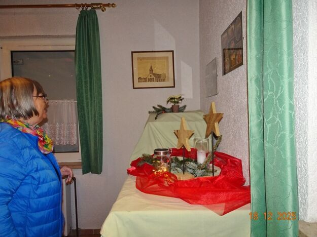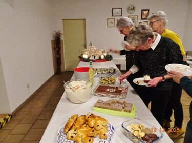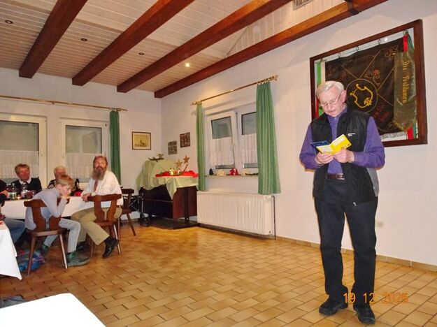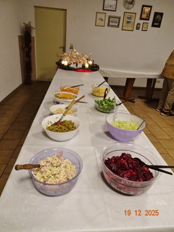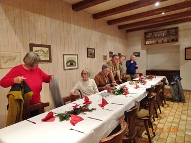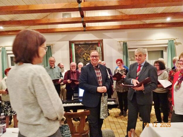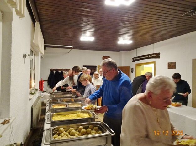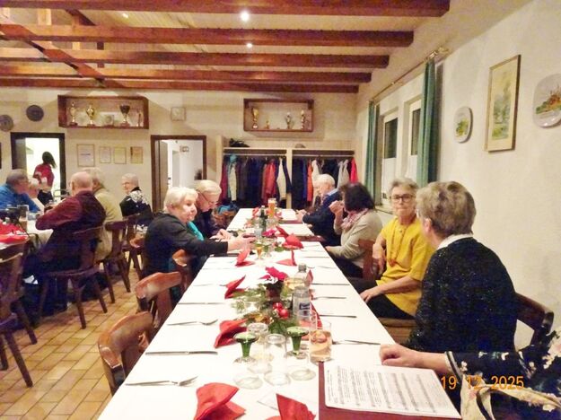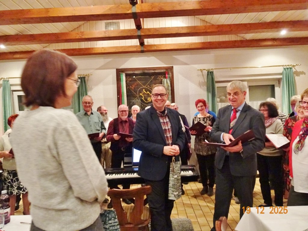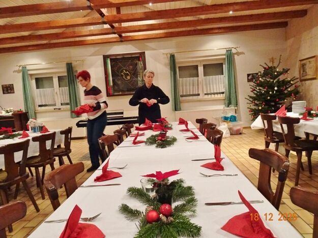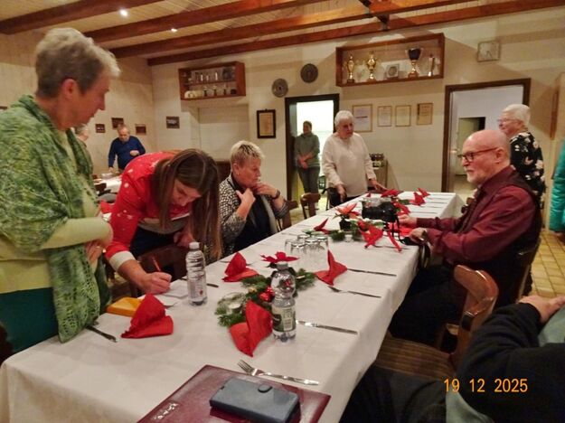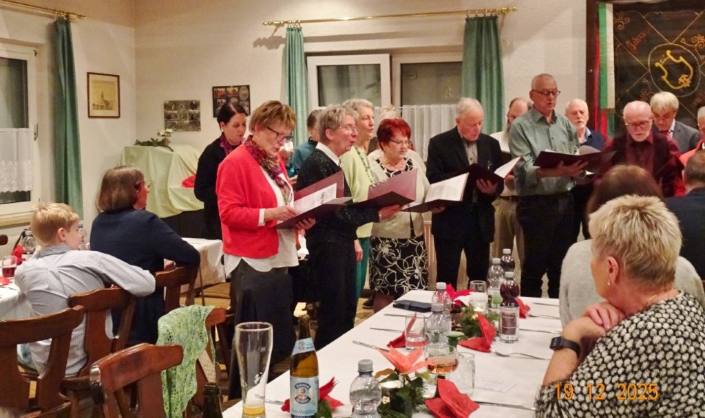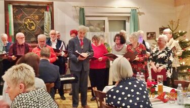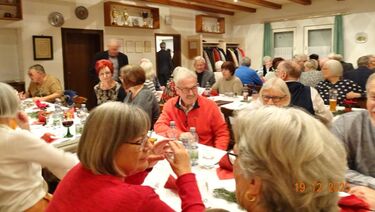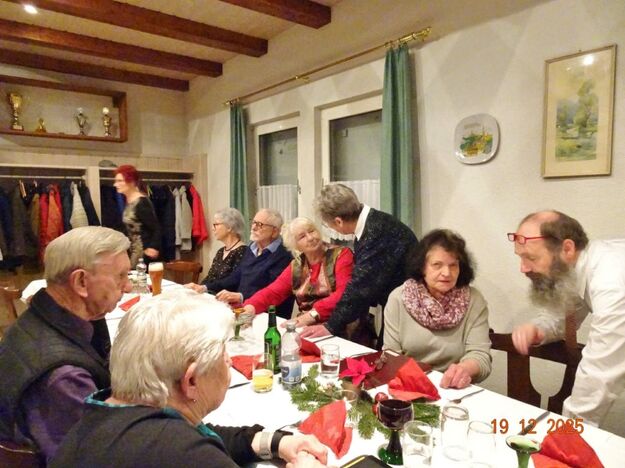 Am Tag zuvor fanden sich ein paar fleißige Helferinnen und Helfer ein, um Tische zu stellen für die Weihnachtsfeier und zum anschließenden Dekorieren. Dekomaterial vor Ort ist genügend vorhanden, da ist so mancher Schatz dabei und es wurde die Saal- und Tischdeko liebevoll zusammengestellt. Ergänzt mit Blumenstöckchen und Tannengrün ergab das ein schönes Bild für die Weihnachtsfeier am nächsten Tag. Nach und nach trafen die Besucher im Erlich ein, darunter unser Ehrenbürger Waldemar Schütz und seine Partnerin. Der Partyservice kam auch pünktlich und brachte die ausgewählten und von Klaus Eichsteller bestellten warmen Speisen, danke Klaus. Die Sängerinnen und Sänger trugen mit Salaten und Desserts zum lukullischen Genuss bei.