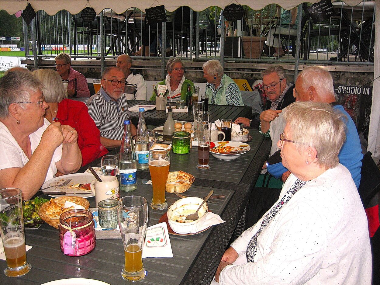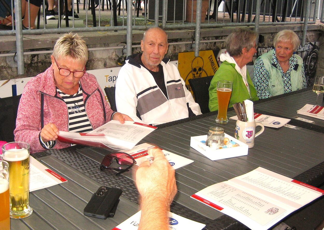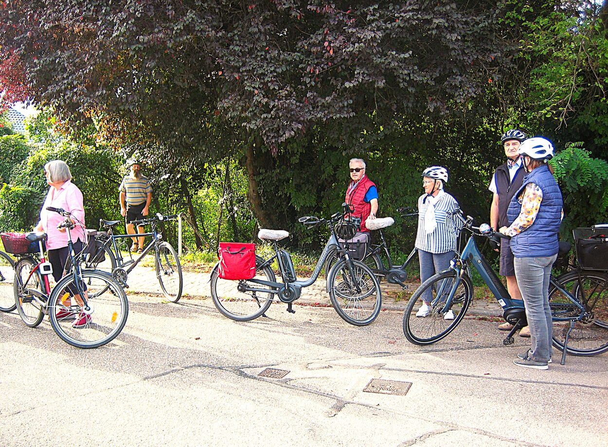 Am letzten Freitag im August startete unsere zweite Ferienradtour. Sie führte uns bei gemütlichem Tempo durch den Hardtwald. Zunächst Richtung Fußballplatz Linkenheim, vorbei am KIT-Campus Nord nach Friedrichstal/Schöneichenjagen. Dann ein Stück die Friedrichstaler Allee nordwärts, an der Bahnlinie entlang um dann über den Reiterplatz via „Altlielser Weg“ unserem Ziel dem FVH Clubhaus zu Gürsel entgegen. Bei unserer 12-köpfigen Radelgruppe befanden sich auch zwei „Heimatforscher“, die plötzlich abhanden kamen. Sie gingen, obwohl am Ende der Gruppe fahrend, ihrem Hobby nach und begutachteten den alten Römerweg, die zugehörige Infotafel und dokumentierten diese mit Fotos. Dadurch verloren sie den Anschluss. Aber Heimatforscher wären keine Heimatforscher, wären sie nicht auch mit den heimatlichen Waldwegen vertraut. Die Gruppe indes wartete auf die Beiden, die jedoch eine andere Route nahmen. Durch diese ungewollte Pause von etwa zehn Minuten bekam das „Hauptfeld“ noch eine kleine Dusche ab, denn es begann zu regnen.