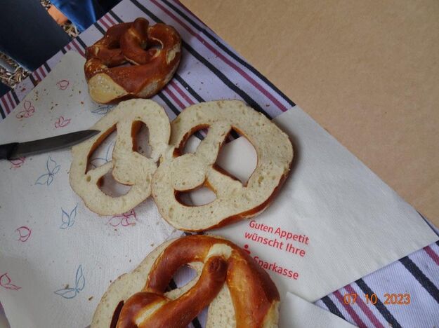 Am 7. Oktober ging´s um 8.30 Uhr los und unser Busfahrer Yilmaz fuhr pünktlich die ausgemachten Haltestellen an. Leider waren doch einige Plätze freigeblieben, aber das tat der Freude auf diesen Tag keinen Abbruch. Unser Vorstand Klaus Reinhardt begrüßte die Anwesenden und unser Busfahrer, der uns großartig chauffierte, stellte sich vor. Dann übernahm unser Commander Klaus Eichsteller die Leitung dieses Tages, mit seinen Astronessen Heidi und Doris zur Seite. Er hatte wieder akribisch diesen Ausflug vorbereitet und unsere erste Andockstelle war an der Fähre in Rheinhausen, wo wir bei „Heidi´s Rhoiheisel“ unsere Brezelpause machten. Ein Danke an Jola und Brigitte, die für leckere Butter-Brezel gesorgt hatten, die am Rhein besonders gut schmeckten. Die von unserem Commander spendierten Schaumküsse rundeten die Pause ab und es ging weiter zu unserem nächsten Ziel, dem Museum Autovision in Altlußheim. Bei einer Führung erfuhren wir viel Interessantes über die Gesamtheit der Entwicklung der Mobilität und die Individualität der Fortbewegungssysteme. Es fing an mit dem Laufrad des Freiherrn von Drais, Motorrädern ab 1885 und die Automobilgeschichte ab 1886, wobei NSU, Motorsport und Wankelmotoren eine große Rolle spielten. Ein Schmankerl fürs Auge waren die von Jean Bugatti designten Fahrzeuge und die Hintergrundgeschichten, die wir von Herrn Schultz erfuhren. Natürlich waren auch E-Mobile und die Zukunft mit der Wasserstoff-Technologie ein großes Thema in diesem sehenswerten Museum. Das gab einigen Gesprächsstoff auf unserer Weiterfahrt nach Annweiler.