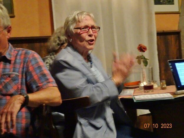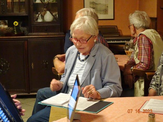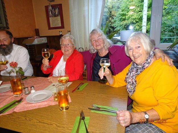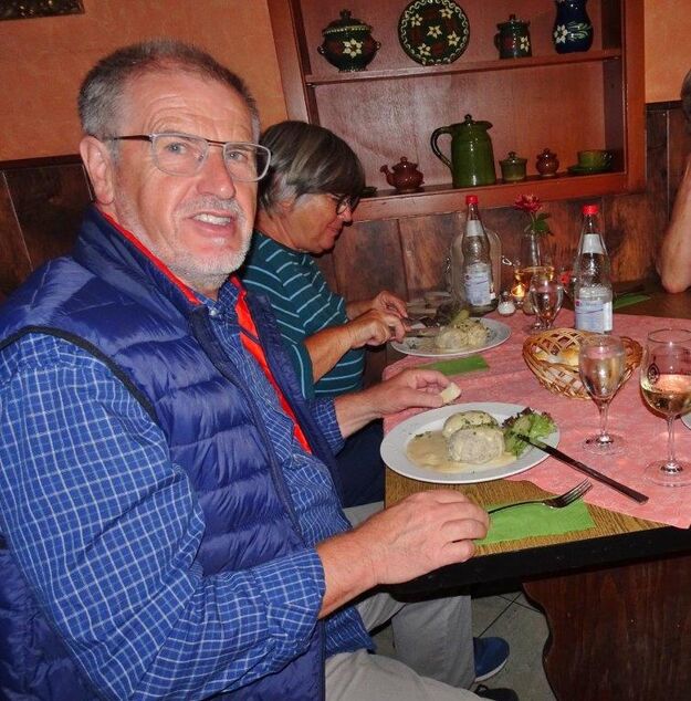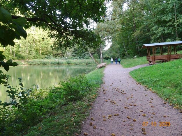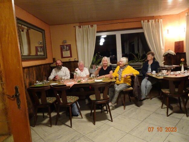 Nun ging´s weiter zu unserem Abschlussziel, dem Edenkobener Tal. Unser Busfahrer musste auf dieser Fahrt Millimeterarbeit leisten – bravo. Die Landschaft ist ein herrliches Wandergebiet, aber uns blieb nur ein schöner Spaziergang zum Hilschweiher und unserem eigentlichen Ziel, der Siegfriedschmiede. Einige, die nicht so gut zu Fuß waren, fuhren mit dem Bus zum Gasthaus, wo schon die Tische für uns eingedeckt waren. Wir nahmen Platz und so konnte die freundliche Bedienung die Getränke- und Essens-Wünsche aufnehmen und wir wurden alle zügig und bestens versorgt. Wie man hörte, hat es rundum geschmeckt, ein Danke an das Siegfriedschmiede-Team. Unser Commander zeigte sich noch von der musikalischen Seite und spielte mit dem Akkordeon stimmige Lieder. Gesanglich von Heidi und Irmgard begleitet wurde geschunkelt und mitgesungen und so langsam ging ein wunderschöner Tag zu Ende. Das „Ausflugs-Schiff“ ist wieder gut in Li-Ho. gelandet, dank unserem exzellenten Bus-Kapitän Yilmaz, dafür ein herzliches Dankeschön. Aber ein ganz großer Dank geht an unseren Commander Klaus, der eine tolle Route mit grandiosen Zielen ausgesucht und sich auch mit Petrus wohlwollend abgesprochen hatte. Unterstützt von seinen Astronessen Heidi und Doris, Jola und Brigitte und auch von unserem Vorstand Klaus Reinhardt, war das für alle Teilnehmenden ein absolut gelungener Tag!