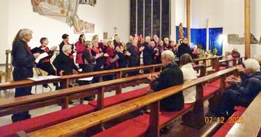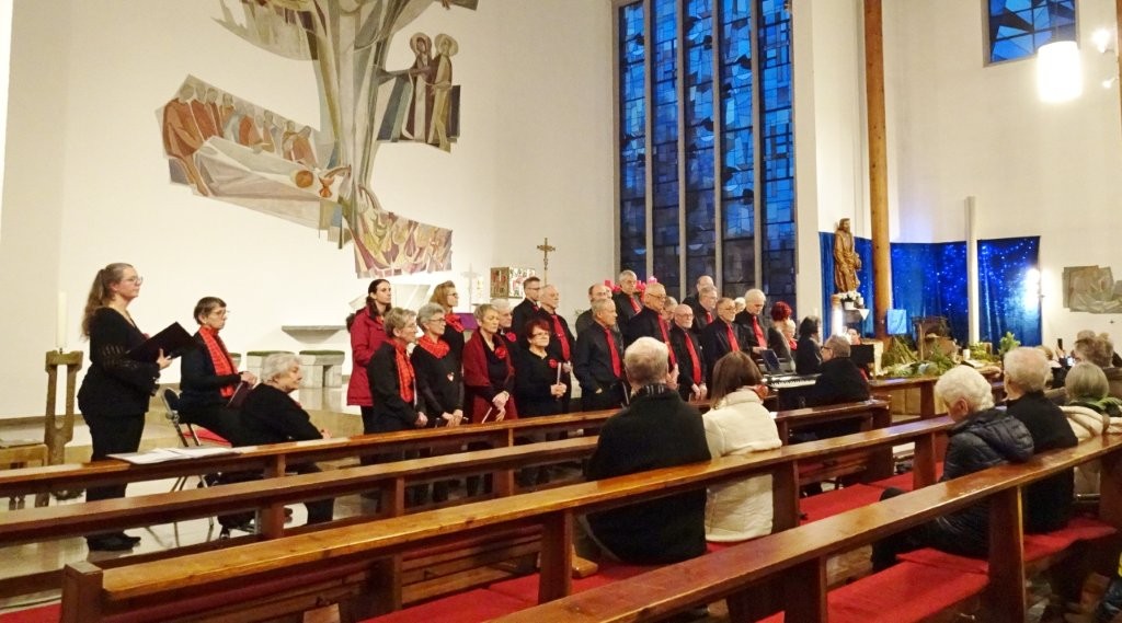 Sonntags am 7. Dezember traf sich unser Chor bereits um 15.15 Uhr in der katholischen Kirche zur Stellprobe und zum Einsingen vor unserem Konzert. Unser Dirigent Aldo war etwas angeschlagen und wir fröstelten alle ein wenig in der kühlen Kirche, vielleicht auch ein wenig vor Aufregung, ob wohl alles klappen würde und ob genügend Besucher kämen. Die Sorge war unbegründet, die Besucher kamen und offensichtlich gefiel auch unsere Liedauswahl. Sie bestand aus internationalen Weihnachtsliedern und stimmungsvollem Harfenspiel unserer Sängerin Silke Stober. Sie hatte zwei Stücke ausgesucht, die gut in die Vorweihnachtszeit passten – ein Klangerlebnis der besonderen Art. Bei unseren Liedern waren auch weltliche Songs dabei wie "Why we sing", bei der unsere junge Solistin Kristin, unser Tenor Harald und unser Bass Hartmut brillierten und auch "Cantar" von Jay Althouse, das die Freude am Singen bestätigte. Hanne Hallers "Vater unser" und Bernd Stallmanns "Vom Flügel eines Engels berührt" fügten sich gut in die vorweihnachtliche Stimmung ein.