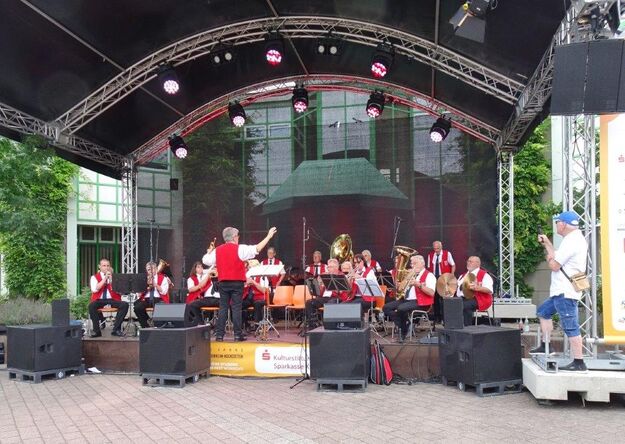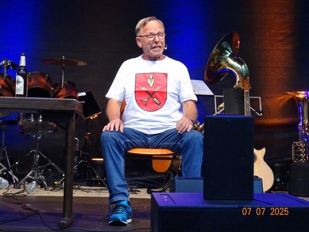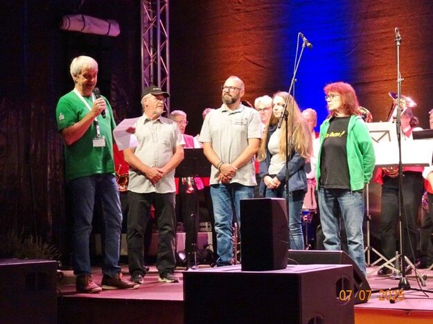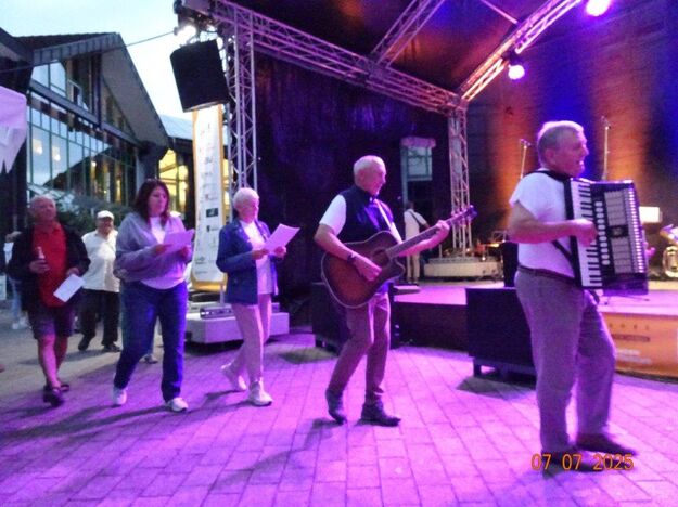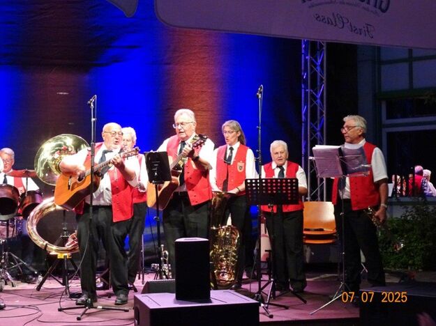 Zum Abschluss des Bunten Abends übernahm dann wieder Uwe Dürr den Dirigentenstab beim Musikzug, denn das obligatorische Badnerlied durfte nicht fehlen. Dazu wurde BGM Michael Möslang auf die Bühne gerufen, er wiederum rief nach Alt-Bürgermeister Waldemar Schütz, der mit ihm die Hymne anstimmte. Die Festgäste hatten sich alle zum mitsingen erhoben und so fand unser schöner Bunter Abend sein Ende. Ein Danke an unseren Vorstand Klaus und ein großer Dank an unsere Gemeinde, dass wir Teil des Programms sein durften und an alle, die dieses Fest mit gestemmt haben. Inzwischen hatte es kräftig abgekühlt und die Gäste verließen den Platz und gingen haam, oder hoom? Auf jeden Fall ins Warme.