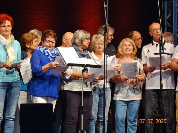 Unser Gemeindefusionsfest begann mit nahezu tropischen Temperaturen. Freitags, wenige Stunden vor Festbeginn, wurden noch fleißig unsere Hütten bestückt, nachdem Tage zuvor die Maultaschen-Produktion auf Hochtouren lief. Hier ein Danke an unsere Macher und Organisatoren Uschi und Rolf und ihre Mitstreiter. Gleichzeitig auch ein ganz herzliches Dankeschön an unseren Sponsor GLOBUS-Wiesental für die Spende. Natürlich auch danke an all unsere aktiven und passiven Mitglieder, die über die Festtage einen großartigen Dienst leisteten und unserem 1. Vorsitzenden Klaus Reinhardt, der immer rundum für Nachschub sorgte, mithilfe unseres 2. Vorsitzenden Markus Ksienzyk. Nur mit solcher Unterstützung kann das Ganze funktionieren! Um 18.00 Uhr erfolgte mit dem traditionellen Fassanstich durch unseren BGM Michael Möslang und der Begrüßung der Delegationen der Partnerschaftskommunen die feierliche Eröffnung des Festes. Und da war viel geboten, mit 3 Bühnen und vielen tollen Bands und anderen Unterhaltungsangeboten, von den Vereinen, Schulen und Ständen, die kulinarisch verwöhnten, Schaustellern und auch die Security und andere Dienste, die hier Bereitschaft hatten, nicht zu vergessen! Kurz, es war rundum für alles bestens gesorgt, um auf dem Festgelände schöne Stunden zu verbringen. Sonntags waren kühlere Temperaturen angesagt, eine richtige Wohltat nach den zwei ersten heißen Festtagen. Die von uns eingeladenen Chöre Da Capo aus Graben und der JCK vom KIT Karlsruhe waren pünktlich vor Ort, um bei unserem Bruderverein Sängerbund Linkenheim, der befreundete Chöre geladen hatte, aufzutreten. Beide Chöre sangen unter neuer Leitung und begeisterten mit modernem Liedgut das Publikum, wobei der JCK größenmäßig und stimmgewaltig beeindruckte und Lust auf sein Sommerkonzert machte. Die Stimmung vor Ort war gut und auch die Nachricht, dass gegen 18.00 Uhr unsere Maultaschen ausverkauft waren, ließ Freude aufkommen. Schade für die, die keine mehr bekamen, aber für uns das Zeichen, dass sie geschmeckt haben, wie wir auch immer wieder bestätigt bekamen. Fazit: Die Maultaschen könnten in unser Festprogramm aufgenommen werden – schaun wir mal. Der Sängermax und unsere Weinschorle waren auch der Renner, so hat sich die ganze Arbeit und Mühe gelohnt und den Verein zusammen geschweißt.