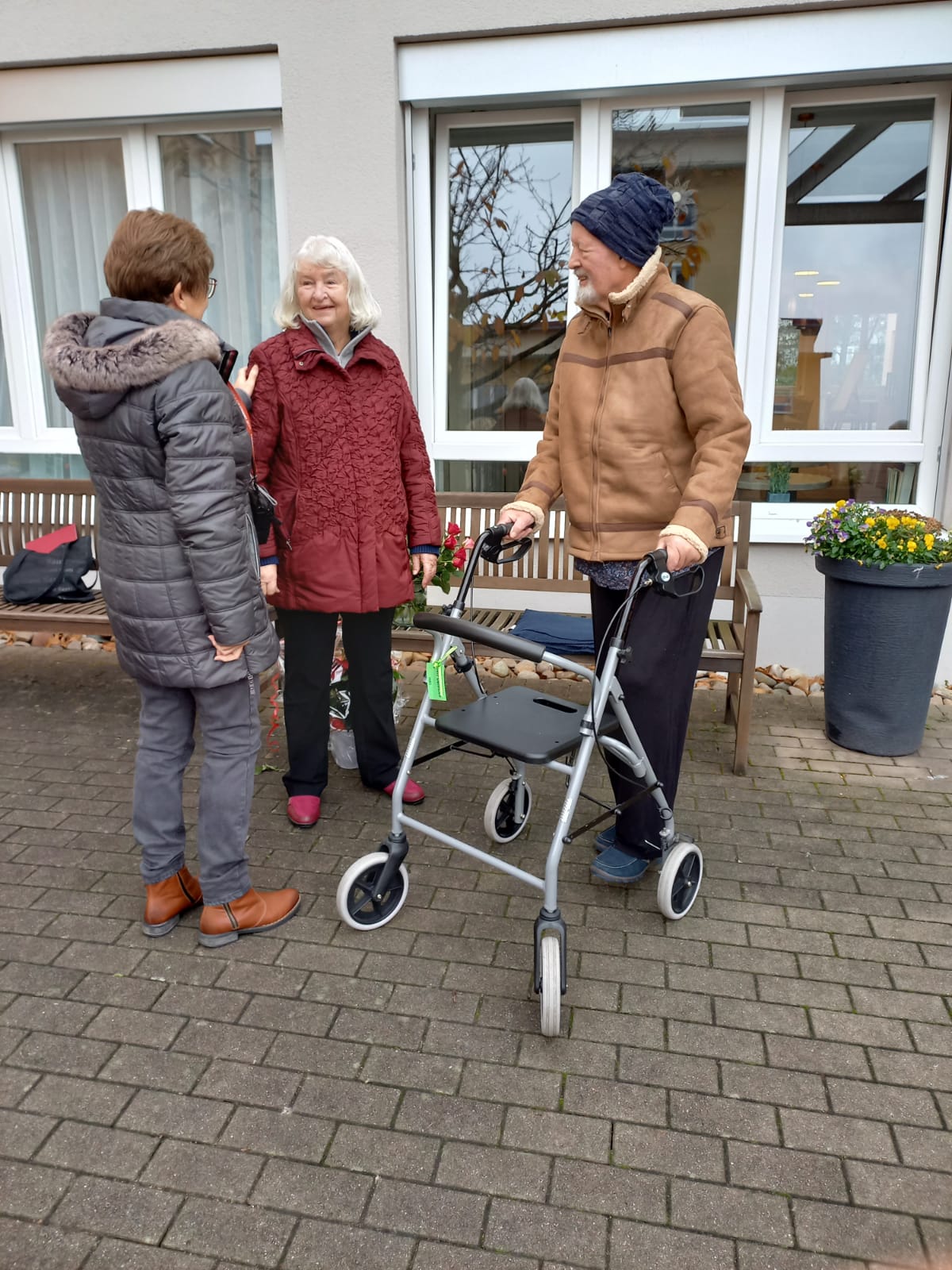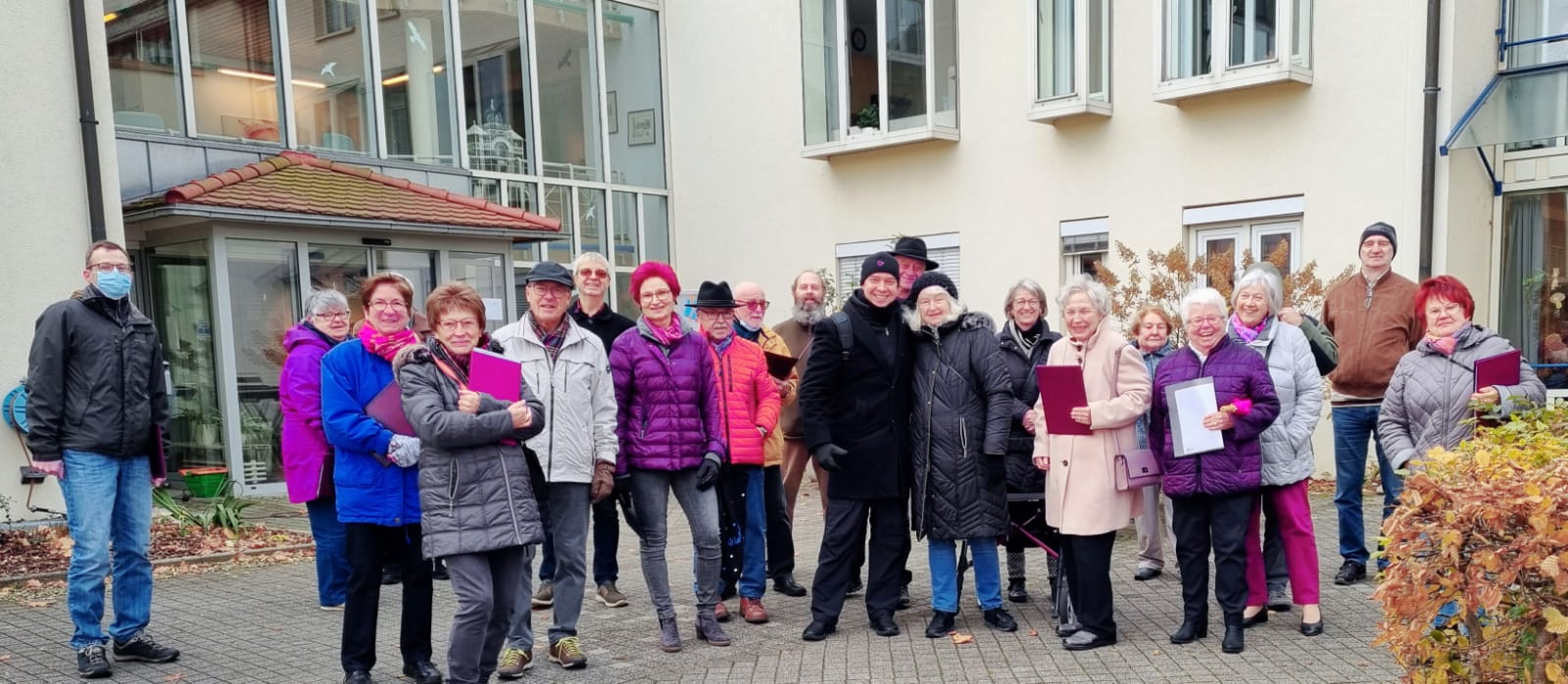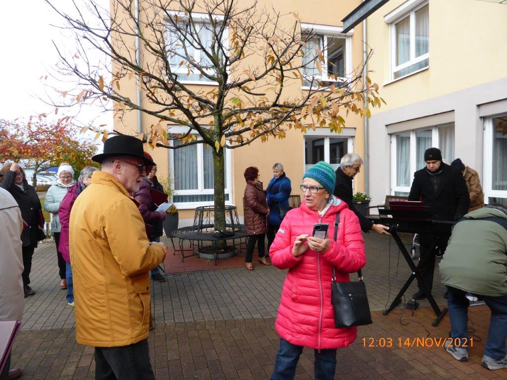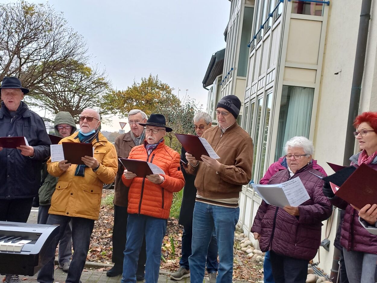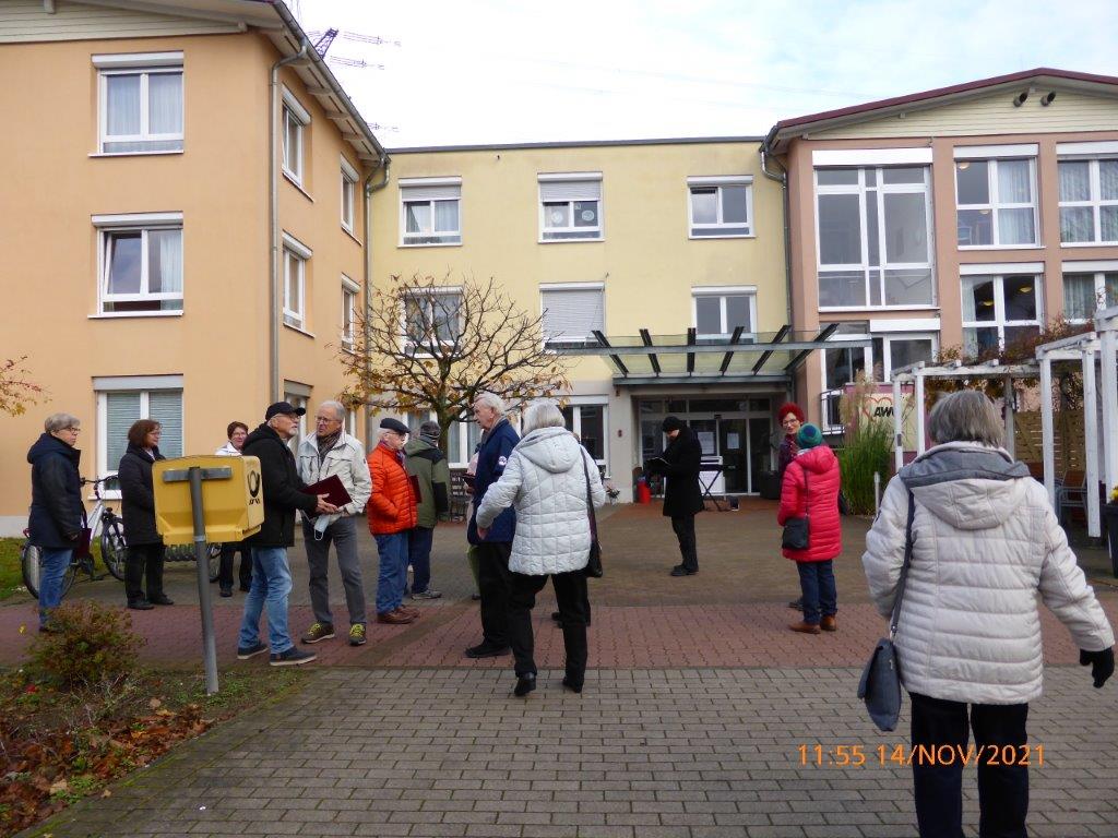 Pünktlich trafen die Sängerinnen und Sänger am Sonntag 07.11. vor dem Altenheim ein. Es war geplant, dass wir einmal vor dem Heim und einmal auf der Rückseite des Hauses singen würden, damit uns möglichst viele Bewohner zuhören konnten. Corona bedingt durften wir das Haus nicht betreten, aber ein Auftritt sollte trotzdem möglich sein. Das Ganze war natürlich auch wetterabhängig, aber wir hatten Glück, es gab keinen Regen, nur Kälte. Wir haben deshalb ganz schön gebibbert, vielleicht manche auch etwas vor Aufregung, war es doch unser erster Auftritt nach langer Zeit. Katja Schwarz begrüßte uns im Namen des Hauses und gab uns das Zeichen zum Beginn, nachdem die Bewohner entsprechend zum Zuhören positioniert waren.