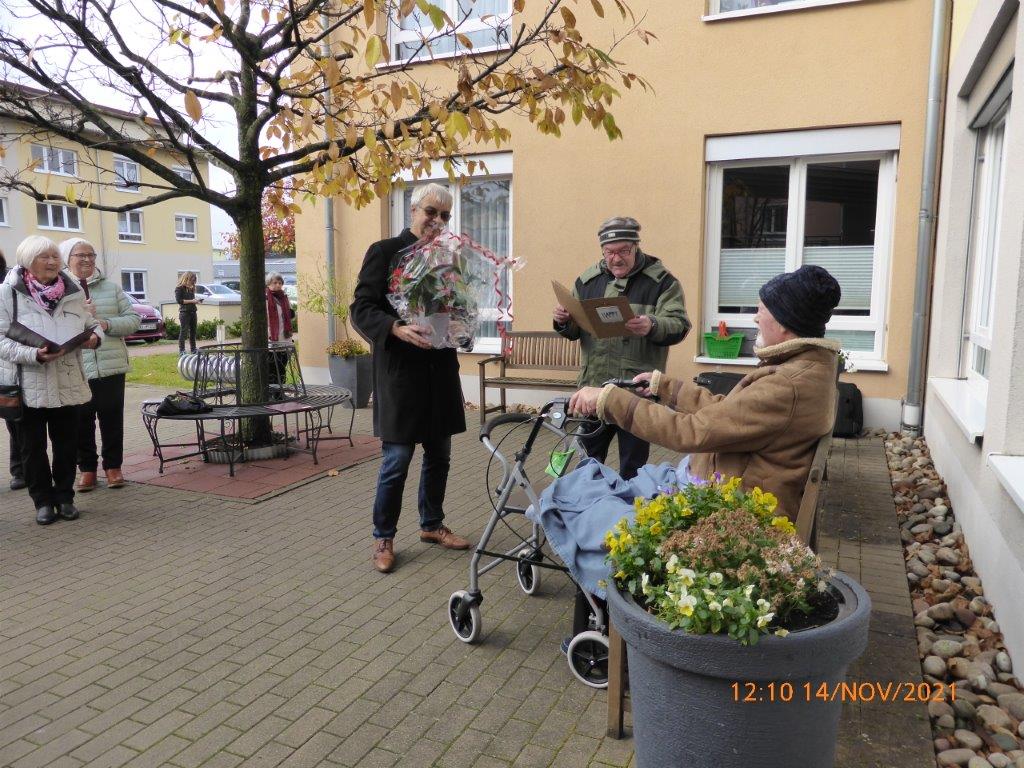 stand dann am Sonntag an. Pünktlich trafen die Sängerinnen und Sänger vor dem AWO-Seniorenzentrum Hardtwald in Eggenstein ein. Rosi war bereits bei Henry vor Ort und brachte den Jubilar vor das Heim, da wir, Corona bedingt, nicht ins Haus durften. Er nahm dort auf einer Bank Platz und wurde von unserem Vorstand Klaus Reinhardt begrüßt und beglückwünscht, bevor wir, in Begleitung unseres Dirigenten Aldo Martinez, mit dem Geburtstagslied den Melodienstrauß für Henry eröffneten. Es waren neue Lieder, aber auch Lieder dabei, die Henry noch mit uns gelernt hat und er freute und bedankte sich bei uns. Klaus Eichsteller las Henry noch ein treffendes Gedicht vor, mit vielen herzlichen Wünschen von seinem „Großartigen Verein“, wie Henry den Chor der Einigkeit immer nannte. Dabei hat auch er selbst immer Großartiges für unseren Verein geleistet, als 2. Vorstand, nichts war ihm da zuviel und er war großzügig und auch immer für jeden Spaß zu haben. Rosi hatte noch Rosen besorgt und jede Sängerin durfte Henry mit einer Rose gratulieren. So bekam er einen Melodienstrauß und einen Rosenstrauß verehrt, mit ganz herzlichen Wünschen von uns allen, auch von denen, die nicht dabei sein konnten. Es war auch anderen Bewohnern möglich unsere Lieder zu hören, was allen sichtlich Freude machte und auch berührte. Ein Dank war uns gewiss und die Freude war ganz unsererseits. Vielleicht lässt sich so ein Auftritt nochmal wiederholen, wir sind gern dabei.