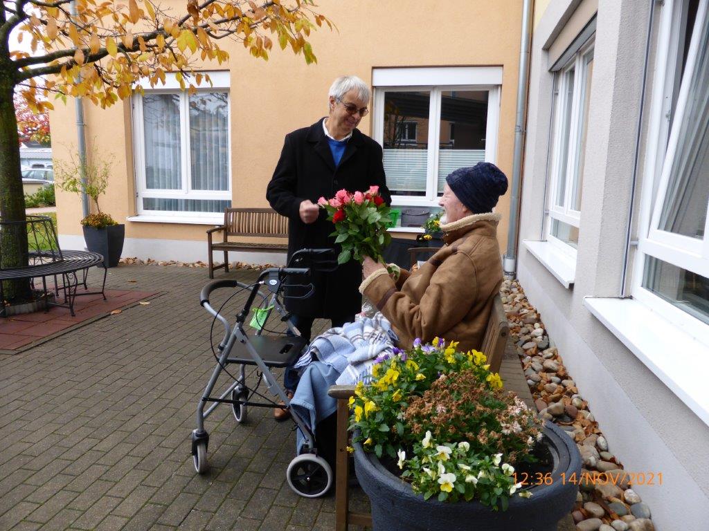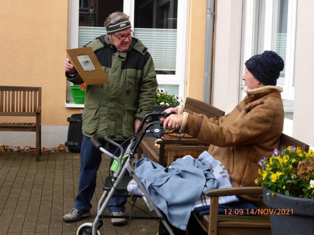 Mit Freude sangen wir unsere vier Lieder, die wir freitags in der Singstunde noch einmal intensiv geübt hatten und als Zugabe hatten wir noch das Hallelujah von Leonard Cohen dabei. Wir haben alles auf jeden Fall gut umgesetzt und unser Dirigent Aldo Martinez, der uns auf dem Klavier begleitete, war sehr zufrieden mit uns. So war die Freude beiderseits, einmal für die Bewohner und einmal für uns. Katja Schwarz hatte uns beim letzten Lied begleitet, als begeisterte Sängerin war das ein Muss und sie bedankte sich herzlich für unseren Auftritt. Bringt das doch auch etwas Abwechslung für die Heimbewohner in dieser anstrengenden Pandemiezeit.