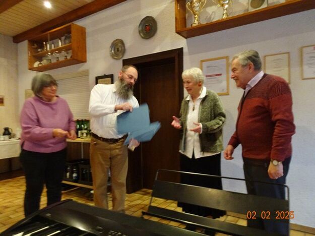 Dann nahm unser 2. Vorstand die Ehrungen langverdienter Mitglieder vor. Für fünfzehnjähriges Singen wurden Heidelore und Klaus Eichsteller mit der silbernen Ehrennadel und Urkunden ausgezeichnet. Wilfried Jung, der nicht leider anwesend war, bekommt beides nachgereicht. Für 30jährige Mitgliedschaft im Verein wurden Angelika und Enzo Piotrowski mit der goldenen Ehrennadel und Urkunden ausgezeichnet, Edgar Krumholz wird auch beides nachgereicht.