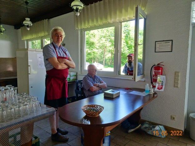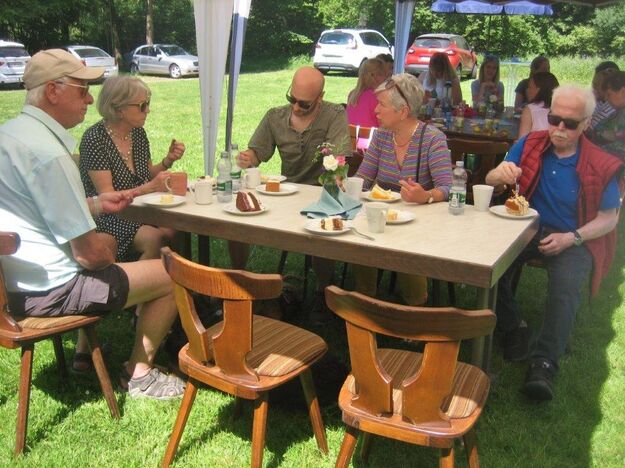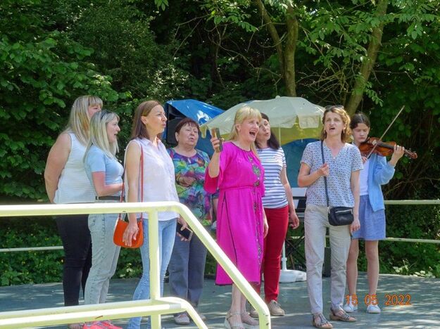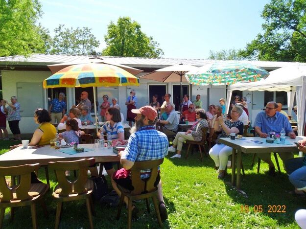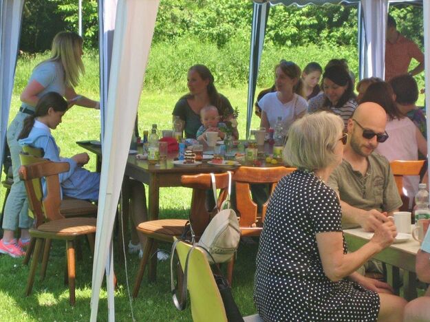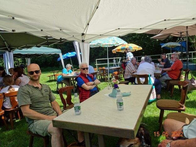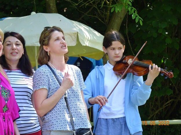 Auch sonntags herrschte schon früh rege Geschäftigkeit, Pavillons, Sonnenschirme, Tische und Bänke wurden aufgestellt und zahlreiche Kuchenspenden gingen ein – vielen Dank an die fleißigen Bäckerinnen und Sponsoren. Im Innenraum wurde auch alles schön dekoriert und die Kuchentheke vorbereitet und bestückt. Wir waren schon etwas aufgeregt, wie wird das Fest angenommen und wie klappt die Verständigung mit den eingeladenen Ukrainern. Christa Jung-Wittiger hatte ein Treffen mit Ukrainerinnen und ihren Kindern organisiert, um ihnen einen schönen Nachmittag zu bieten. Neuland für uns, aber es war ein absolut positives Erlebnis und die ukrainischen Frauen bedankten sich bei uns auf der Bühne und sangen einige Lieder für uns. Viel Seele war da zu hören und zu spüren und auch ergreifend das großartige Geigenspiel der jungen Marie. Ein Talent, das unbedingt gefördert werden muss! Hatte sie just an diesem Tag Geburtstag und bekam von unserer Jola ein Geburtstagspräsent überreicht, danke, Jola und danke Christa für das Sponsoring für die Kinder. Den Ukrainerinnen ganz herzlichen Dank unsererseits für diese wunderbare Einlage, wir würden uns über weitere Begegnungen freuen.