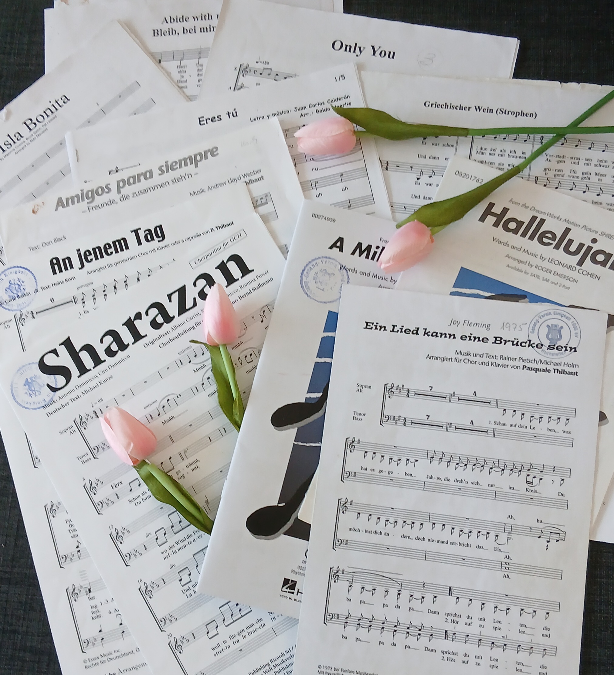 Wir singen vorwiegend deutsch, aber auch mal englisch, italienisch, spanisch oder sogar auch mal afrikanisch. Schließlich sind wir multikulti. Unsere Lieder sind den meisten bekannt und oft richtige Ohrwürmer. Wie das bekannte „Amigos para siempre“, das durch die Olympiade 1992 weltweite Bekanntheit erreichte. Oder Peter Maffays „Über 7 Brücken musst du gehen“, ein Kracher, den man einfach nicht vergessen kann. Auch zwei ESC-Hits finden sich in unserem Repertoire und begeistern nach wie vor unsere Gäste und Zuhörer wie Joy Fleming’s „Ein Lied kann eine Brücke sein“ und das „Eres tu“ von Mocedades. Und wer kennt von der Münchner Freiheit das „Ohne dich“ nicht? Wir singen es. Auch ältere Hits wie das „Weit, weit weg“, das „Only you“ oder Frank Sinatra’s „My Way“ sind dabei. Natürlich fehlen Abba und Udo Jürgens ebenso wenig wie Herbert Grönemeyer. Sein „Mambo“ erzählt sehr realistisch und sängerisch vom bekannten Parkplatzsuchproblem. Aber auch der „Irische Segenswunsch“, das „Abide with me“ oder das weltbekannte „Halleluja“ von Leonard Cohen befindet in unserem ständigen Repertoire. Unsere neuesten Lieder, die wir gerade einstudieren, sind „Sharazan“ von Romina und Al Bano - vor 45 Jahren sehnsuchtsvoll interpretiert- und der englische Hit „An jenem Tag mein Freund“ (den meisten wohl als „Those were the days) bekannt. Wer kennt es nicht, das beeindruckende „A Million Dreams“ aus The Greatest Showman? Ein Hit, den wir sehr gerne singen, weil er einfach nur wundervoll klingt. Und - gefällt dir diese Auswahl? Natürlich haben wir noch viele weitere Lieder. Ich denke, da ist für jeden Geschmack was dabei. Also auch für Dich? Überzeuge dich selbst.