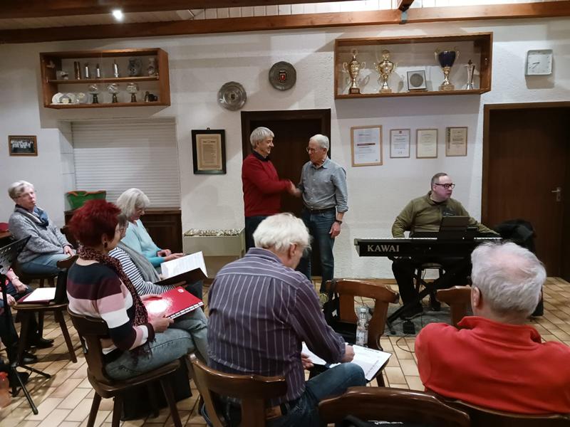 Zum Ende der Singstunde durfte dann Uschi noch aktiv werden, denn sie dirigierte uns bei ihrem gespendeten Lied „Für Alle“. Und auch hier zeigte sich wieder mal, dass ständiges Üben den Meister ausmacht.