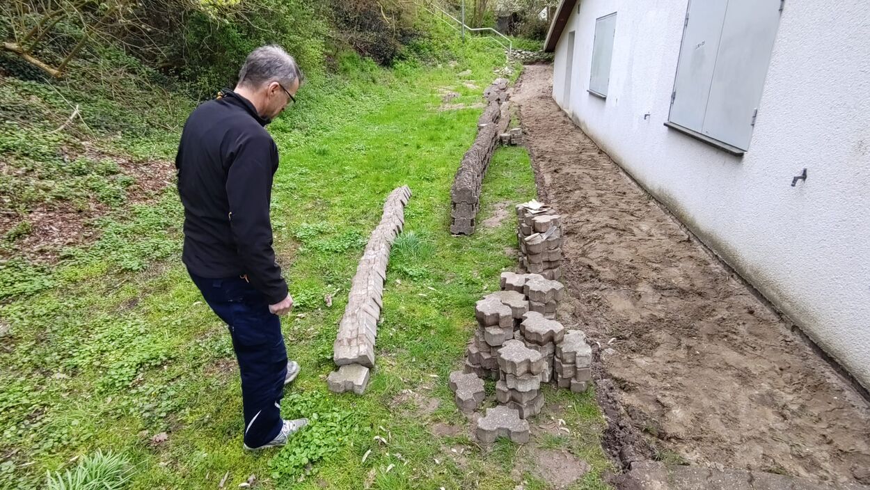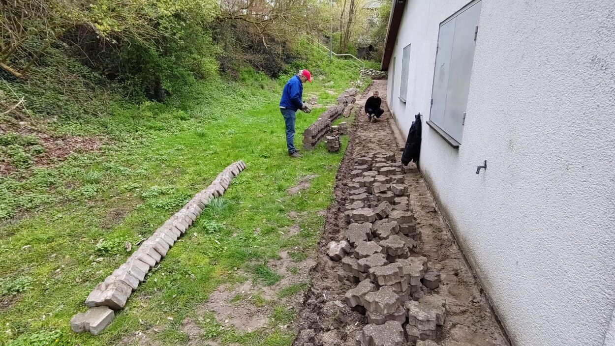 Auch wenn Ferien waren und damit keine Singstunde stattfand, ruhten wir uns nicht aus. Das Vereinsheim und sein Gelände brauchen auch ab und zu Pflege, denn es soll natürlich nicht nur für unsere Mitglieder schön und sicher sein, sondern auch für unsere Besucher und/oder neuen Sängerinnen und Sänger. Leider war der Weg von der Treppe bis zur Bühne sehr uneben und hatte sehr viele Stolperfallen, die beseitigt werden mussten. Deshalb war es für uns wichtig, dass die Pflastersteine neu verlegt werden, was eine Fachfirma vergangene Woche aus ausführte. Vorher mussten aber erst noch die wackligen Steine entfernt werden. Aus diesem Grund warfen sich einige von uns noch vor den Ostertagen in ihre Arbeitsklamotten, krempelten die Ärmel hoch, spuckten in die Hände und legten los: Knochensteine wurden in mühsamer Arbeit rausgenommen und nebenan auf dem Rasen gelegt, schließlich wurden sie ja wieder verwendet. Danke Gotthard, Jola, Klaus, Norbert, Robert und Thorsten für eure große Hilfe.