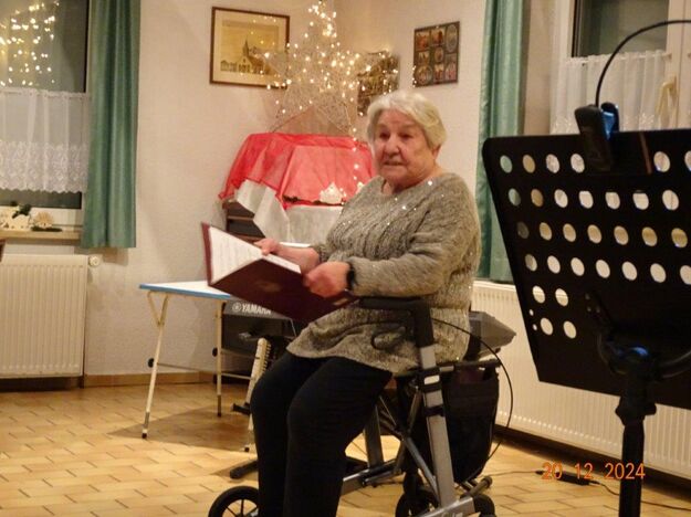 Unsere Weihnachtsfeier fand am 20. Dezember im richtig schön geschmückten Vereinsheim statt und war sehr gut besucht. Aldo Martinez traf mit Frau und Sohn pünktlich im Erlich ein und wir begannen den festlichen Abend mit vier Weihnachtsliedern, die wir gekonnt absolvierten. Der 1. Vorsitzende Klaus Reinhardt begrüßte freudig alle Anwesenden und eröffnete danach das Buffet. Ein Partyservice hatte uns die warmen Speisen geliefert und von den Sängerinnen wurden wieder tolle Salate und Desserts beigesteuert. Nach dem Essen eröffnete Klaus Eichsteller mit einem Hirtenlied und einer Wintermärchen-Liebesballade auf seinem Keyboard das Unterhaltungsprogramm, durch das uns unser Sänger Hartmut auf lockere Art führte. Reinhilde Fürniß trug zuerst ein Gedicht vor, bevor sie uns dann mit ihrer Gitarre ein Lied über die weiße Weihnacht spielte und sang – gut gemacht Reinhilde. Christa Jung-Wittiger las ein Gedicht über eine freche Weihnachtsmaus vor, die wohl über Tage für den Schwund der Weihnachtsbrödlen verantwortlich war. Das gefiel besonders den anwesenden Kindern, die dabei sein und mit uns feiern durften. Hannelore Dürr´s Engelsgedicht zeigte einige Erkenntnisse auf, die uns zwar bewusst, aber leider doch oft nicht umgesetzt werden. Das regte zum Nachdenken an, bevor wir uns dem reich bestückten Dessertbuffet widmen durften, mmhm, lecker!! Es ging uns gut an diesem Abend, auch dank unserer Küchenfeen Alexandra und Heidi, sowie Marion, die uns mit Getränken versorgte, so ließ es sich bestens aushalten. Nach diesen Schlemmereien war es an der Zeit, unserem Dirigenten ein Präsent zu überreichen. Klaus Reinhardt tat dies mit einigen Dankesworten an Aldo Martinez, mit dem das Üben in der Chorprobe Woche für Woche riesigen Spaß macht. Wer dies auch mal testen möchte, kann gerne freitags in den Erlich kommen. Zu Klaus Reinhardt`s Überraschung erhielt auch er eine Weihnachtstüte, als kleine Anerkennung für seine Arbeit als 1. Vorsitzender, die er das ganze Jahr über leistet. Ein Dank auch für den wunderschön geschmückten Weihnachtsbaum, den uns Klaus jedes Jahr für unsere Feier im Erlich zur Verfügung stellt.