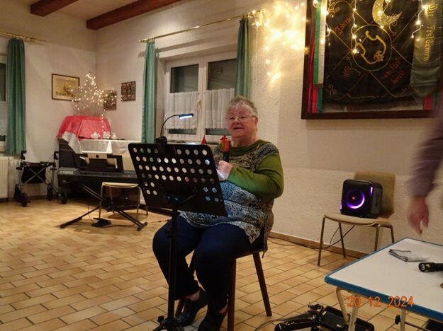 Hartmut führte uns nun wieder souverän durch den 2. Teil unserer Feier, bei dem uns Commander Klaus Eichsteller, bzw. Mc. Beth in seinem Raumschiff Entenfang durch die Galaxien führte und letztendlich mit Leonard Cohens Hallelujah in den Stall des Jesuskindes und dem Sinn der Weihnacht entführte. Brigitte Lang wusste uns eine lustige Geschichte vom doppelten Santa Claus zu erzählen und Klaus Reinhardt hatte eine Geschichte über „Selbstverständlichkeiten“ mitgebracht, wie wahr, dass doch vieles als selbstverständlich betrachtet wird und einem dies erst bewusst wird, wenn man es verloren hat, oder es mit den Augen eines Kindes betrachten kann. Zum Schluss des Programms spielte Klaus Eichsteller das schöne irische Weihnachtslied Fairytale of New York und gemeinsam sangen wir noch einige Weihnachtslieder, bevor dieser schöne Abend langsam zu Ende ging. Ein großes Danke hier wieder an Klaus Eichsteller, der mit seinen musikalischen und anderen Beiträgen einen Großteil des Programms gestaltete und natürlich an Hartmut, der einen guten Conferencier abgab, ebenso allen anderen, die sich am Programm beteiligten. Zudem an alle, die den Erlich so toll gerichtet, dekoriert und hinterher wieder aufgeräumt haben, Ute für die Blumendeko und allen, die für unser leibliches Wohl Leckeres zubereitet hatten. Ihr habt uns allen ein schönes Fest beschert – herzlichen Dank.
